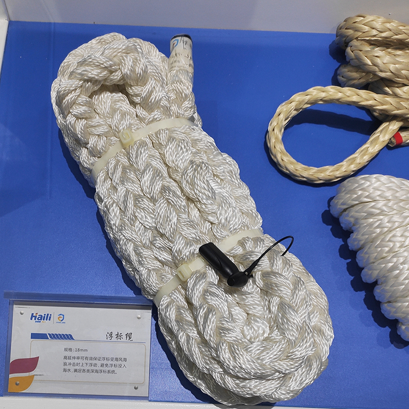 采用優質高強尼龍纖維,可定制直徑15mm~60mm浮標專用繩纜,經過特殊后整理工藝,斷裂強力50kN~600kN,延伸率20%~45%,高延伸率可有效保證浮標受海風海浪沖擊時上下浮動,避免浮標沒入海水,這款浮標纜繩滿足各類深海浮標系統。
